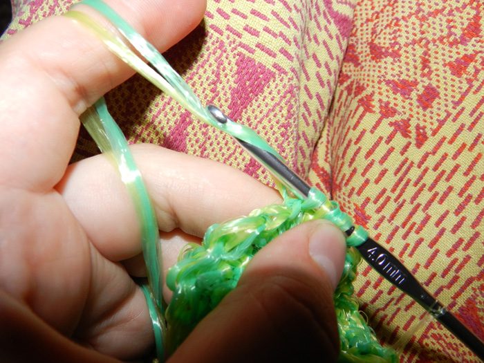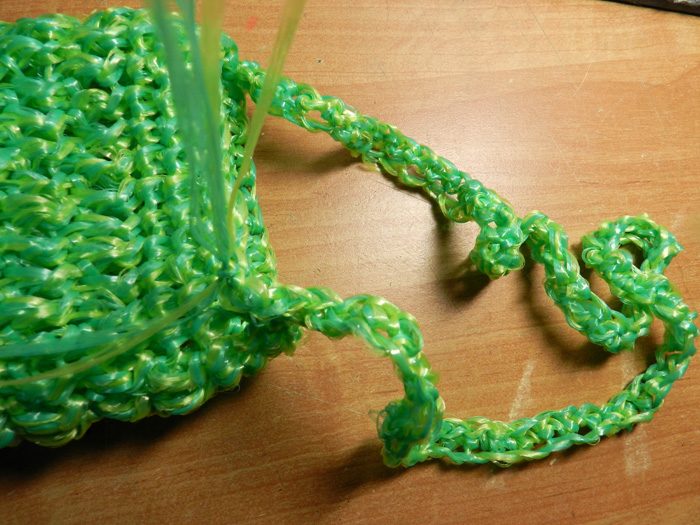 После закрепления цепочки приступаем к обвязыванию ручки. Принцип тот же, что и при начале вязания основного полотна. В каждую петлю воздушной цепочки вывязываем столбики без накида. Достаточно одного ряда, но вы можете связать ручки потолще. Завершив ряд, провязываем еще две-три петли в кромке мочалки для надежности. Вытягиваем петлю и затягиваем узел. Нить обрезаем.