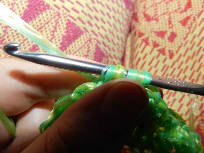 Если вы хотите, чтобы мочалка имела тонкое и аккуратное плетение, выбирайте крючок тоньше. Но не забывайте, что вам придется вывязывать две нити. Головка крючка не должна быть острой, иначе будет рвать волокна полипропилена.