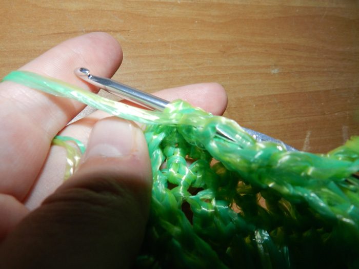 Закрепляем конец цепочки, провязывая несколько столбиков без накида, на середине края мочалки, так, чтобы крепления будущей ручки были симметричны.