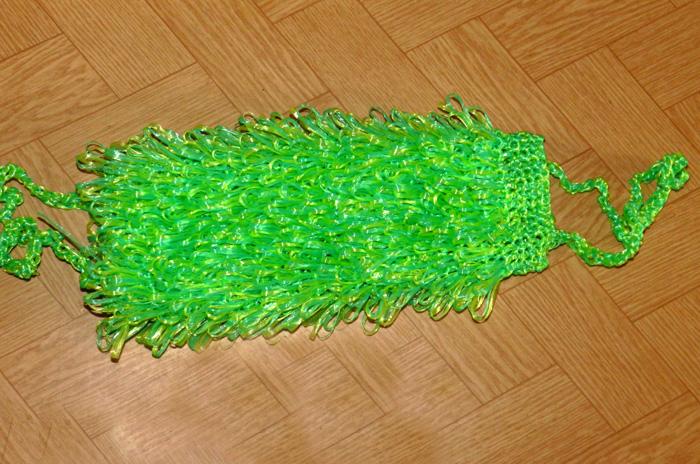 Вторая ручка вяжется по тому же принципу, что и первая. Для начала привязываем две нити к краю мочалки, закрепляем ее, провязывая в кромке парку петель. Делаем цепочку, закрепляем симметрично, обвязываем ее необходимым количеством петель, закрепляем в кромке парой петель. Выворачиваем мочалку «лохмушками» наружу.