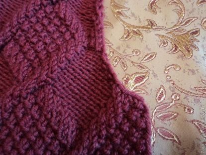 Связав 24 см, я закрыла с одной стороны 6 петель и с другой — для пройм. Делать это надо постепенно. Я вначале 3 петли закрыла, потом 2 и в конце 1.