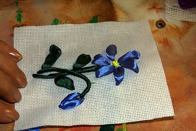 Делаем стебелек для бутона. Для этих целей лучше использовать ленту поуже. Загибаем и прокалываем канву рядом с основным стеблем. Закручивая, формируем дополнительный стебелек и размещаем его сбоку, продевая под лепесток цветка.