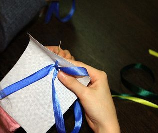 Для декоративного панно ленты можно не закреплять. Если же вы делаете вышивку на одежде, лента закрепляется следующим образом: отрезаем, оставив небольшой кончик, закручиваем его в рулончик и пришиваем.