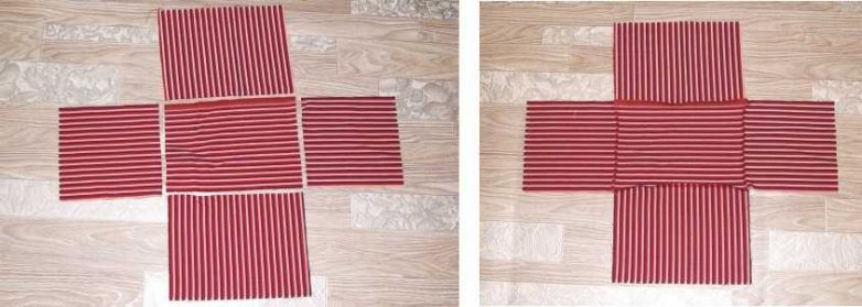 1. Ткань раскраивается по размерам ящика (все стороны предварительно измеряются линейкой) и сшивается на швейной машинке. Таких выкроек делается 2 штуки — получаются как бы чехлы для внутренней и внешней стороны.