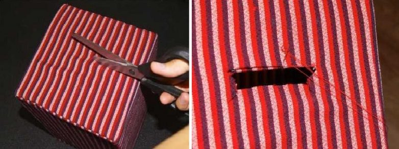 4. По бокам вырезаются дырки для ручки, ткань сшивается по краям. При желании можно на боковых сторонах коробки пришить ручки для переноски (делаются из цветной тесьмы).