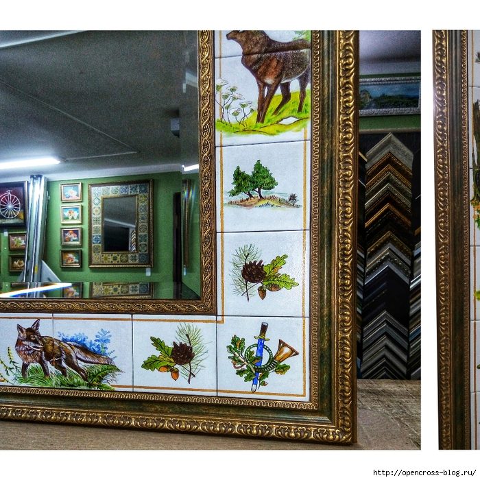 Хочу представить вам свою работу. Зеркало в керамической плите, расписано в ручную. Авторская ручная работа. Дизайнерское зеркало — великолепное стильное дополнение к любому охотничьему интерьеру — будь то загородный особняк, трофейный или каминный зал, ресторан в охотничьем стиле и т.д. Этот вариант выполнен на заказ. Эскиз утверждал сам заказчик. Оформление багетной мастерской Багет-Сервис.