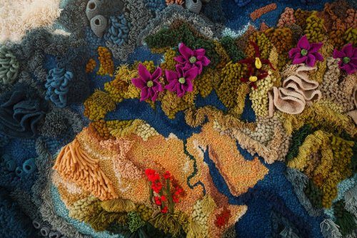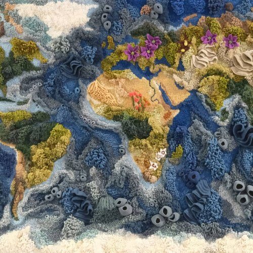 Используя спектр различных техник, в том числе сухое валяние, вязание крючком и другие, она разработала и создала текстурную поверхность, имитирующую карту мира.