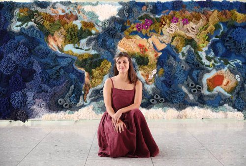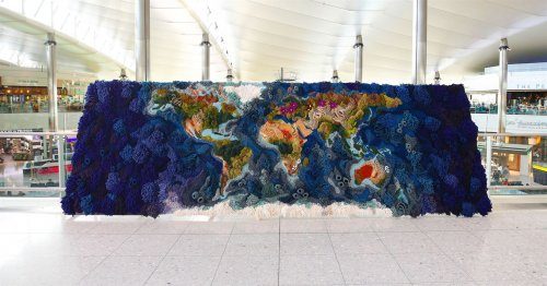 Разнообразие климата и топография Земли создавались с помощью пряжи полностью вручную в течение более 520 часов. Размеры текстильной карты составляют 6 метров в ширину и 2 метра в высоту, а на её создание потребовалось 8 кг джута и хлопка и 42 кг повторно используемой шерсти. Гобелен можно увидеть в зоне вылета в аэропорту Хитроу (Terminal 2).