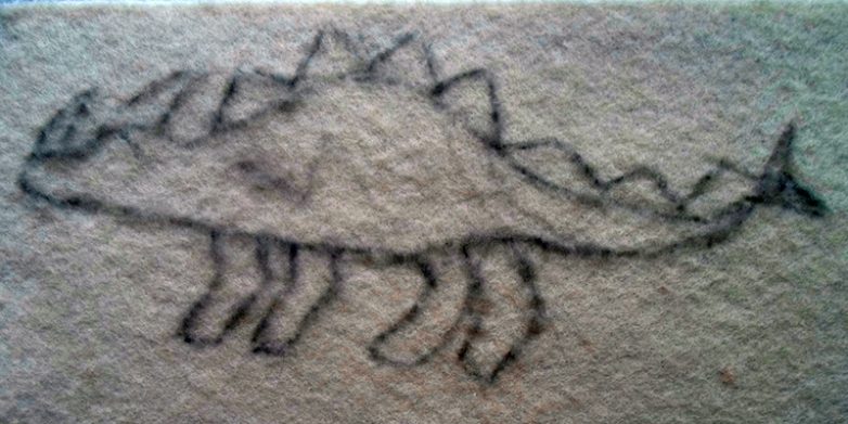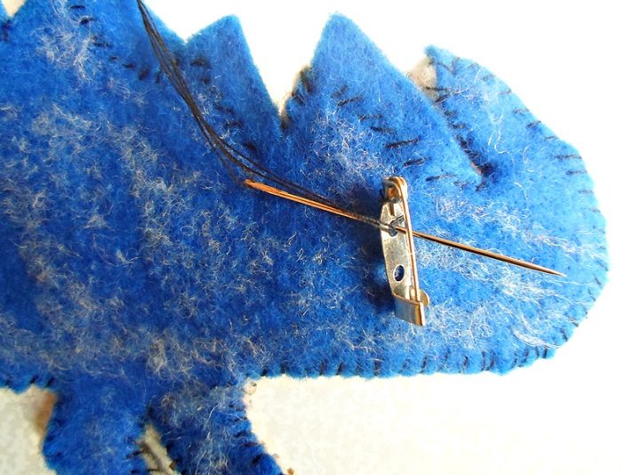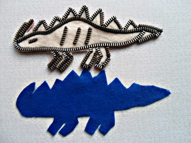 Когда контур полностью обшит, вырезаем фетровую основу. Делать это нужно аккуратно, для того чтоб не повредить нити, которыми пришивалась молния. Прикладываем динозавра к листу фетра для изнанки, обводим и вырезаем нужную заготовку.
