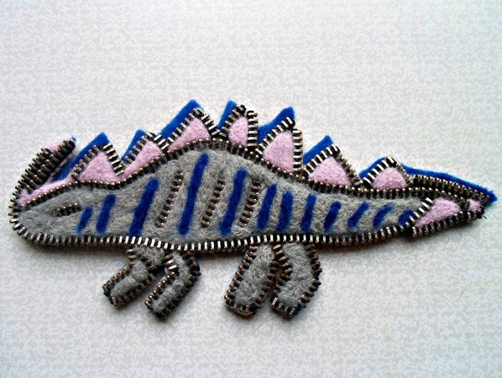 Молнию можно пришивать двумя способами: либо положив её на ткань, либо поставив зубцами вверх. В моей работе молния пришита в горизонтальном варианте. На изгибах молнию нужно немного поворачивать в нужном направлении, крепко фиксируя, а в местах, где есть мелкие детали, я использовала небольшие кусочки молнии, обрезая ножницами по нескольку зубцов, таким методом получился гребень на спине, ноги динозавра, поперечные полосы и глаз.