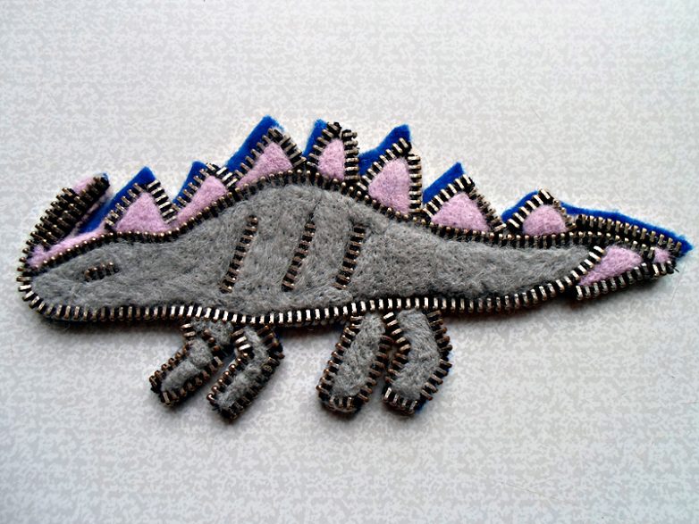 Итак, рисунок динозавра готов и начинается самая длительная и кропотливая работа — пришивание молнии по контору всего изделия. Пришивать следует, фиксируя каждый зубчик молнии с помощью обычной швейной нити, цвет которой соответствует цвету основы молнии либо шерсти для набивания. Возможно в процессе пришивания контура, у вас возникнут некоторые расхождения с изначальным рисунком, так как объемное изделие всегда выглядит немного иначе.