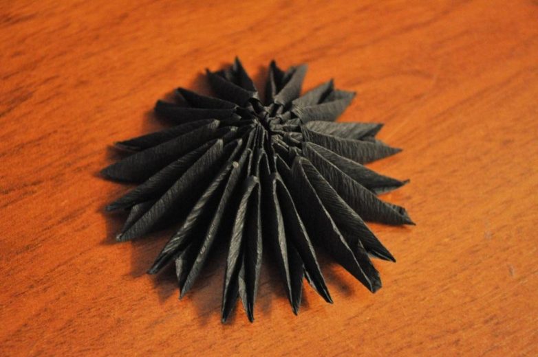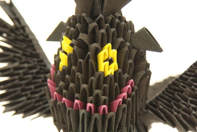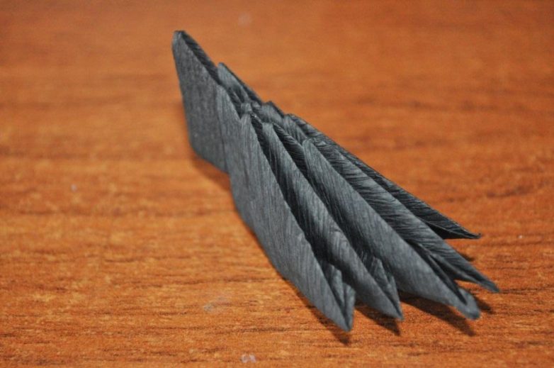Для этого с двух сторон туловища, немного отодвигаем по модулю, чтобы надеть на них крылья. Технология точно такая же: уголки туловища вставляются в кармашки крельев.