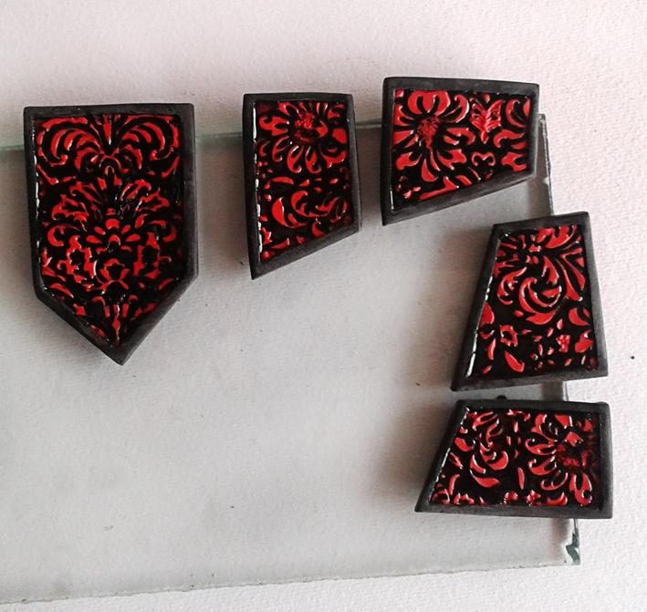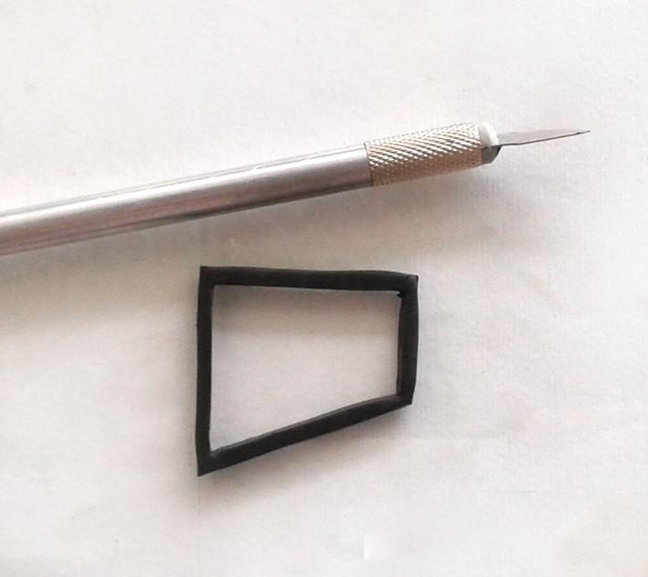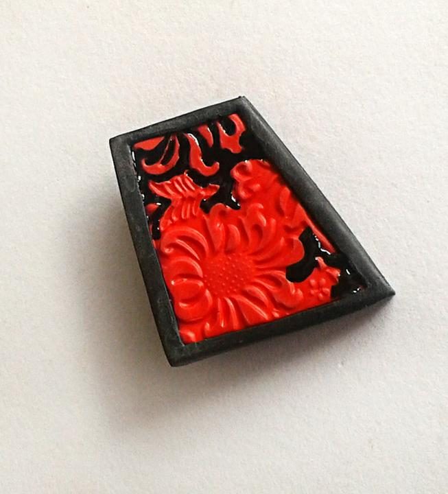 На тонкий пласт черной глины выкладываем красный элемент с черной рамочкой и обрезаем по контуру.