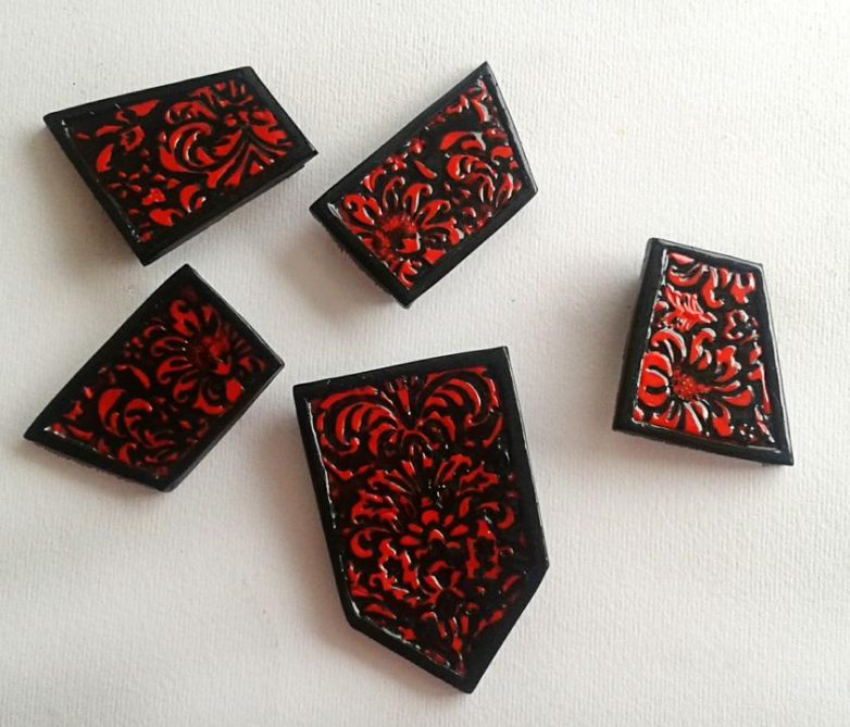 Отправляем детали запекаться. Можно попробовать обходится без промежуточных запеканий, но тогда можно нечаянно смазать рисунок и украшение получится не таким аккуратным. Когда элементы остыли, выкладываем их на пласт черной глины, толщина которого должна быть немного больше толщины красных деталей.