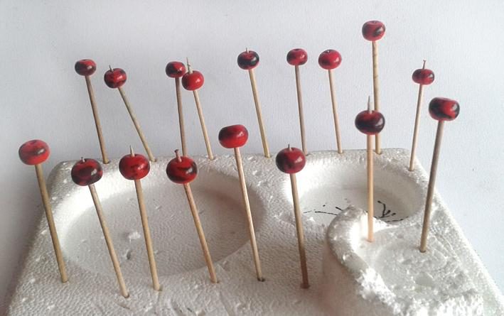 Пока пластика растекается, из красной пластики делаем бусины: по одной на каждый стык между элементами и еще несколько штук по краям, в зависимости от длины готового колье. Отверстия в них делаем сразу зубочисткой. Толщина зубочистки идеально совпадает с толщиной вощеного шнура. Все вместе отправляем запекаться последний раз.