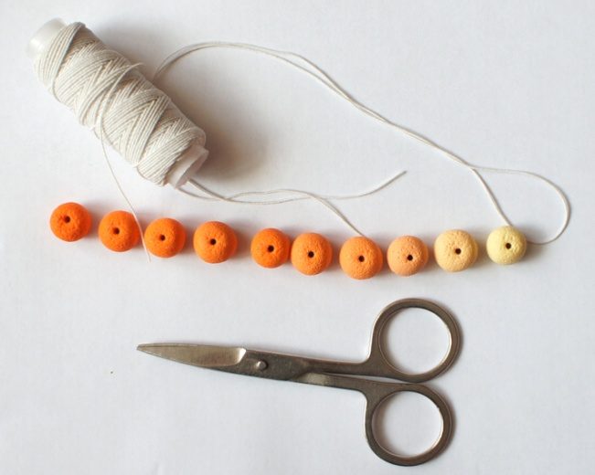 Делаем несколько подвесок желтого и оранжевого цветов, выкладываем на стекло к бусинам.