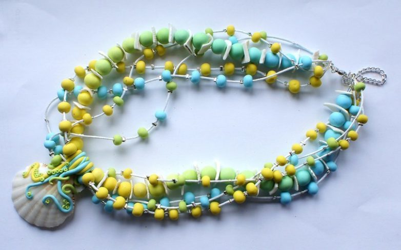 Разумеется, освоив эту интересную технику, вы сможете использовать ее для создания и других украшений и аксессуаров. Например «радужные» бусы смотрятся не менее интересно.