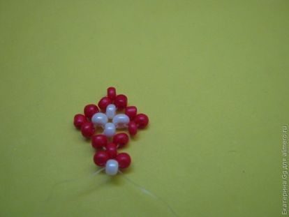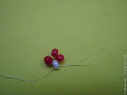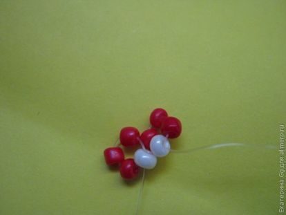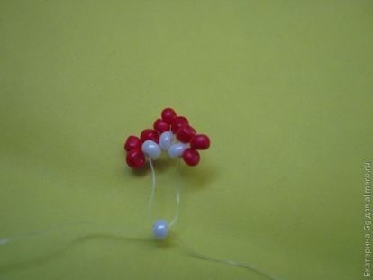 Берем длинный кусок лески (его будем в двое сгибать), набираем 3 красные бисеринки и 1 белую, через белую проходим двум концами лески навстречу.