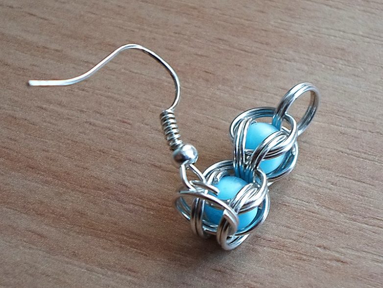 Серьги в технике кольчужного плетенияЕсли же у вас остались бусины, кольца и вдохновение, то к браслету можно сделать подходящие серьги в такой же технике. Для каждой серьги необходимо сделать 2 — 3 соединительных звена с бусинами, в зависимости от желаемой длины.