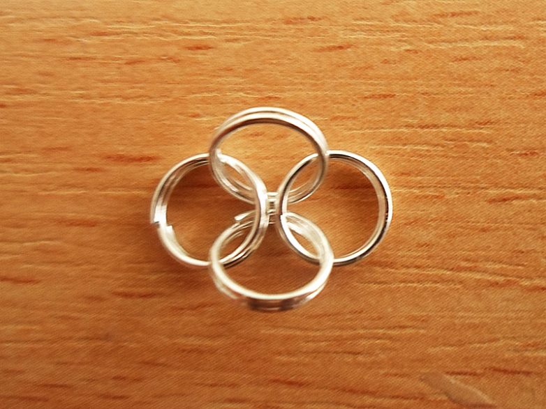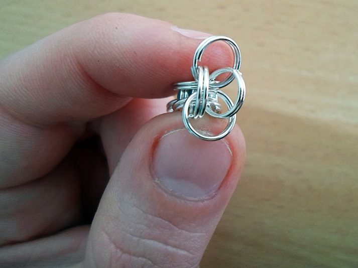 Вытащив иголку, зажимаем первое кольцо узкогубцами и при помощи пальцев или пинцета протягиваем два других кольца, пока они не освободятся из зажима проволоки и не окажутся внутри основного. После чего продеваем сквозь эти два кольца ещё одно, таким образом, что бы получилось две пары соединённых между собой колец.