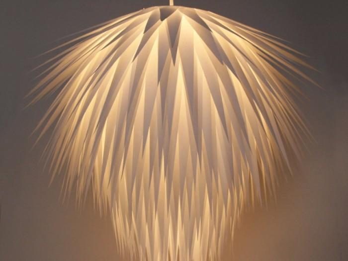 Также элементарно делается абажур из одноразовых пластиковых стаканчиков, которые скрепляются степлером. Данный абажур имеет достаточно неплохие светотехнические характеристики, но при этом вид достаточно утилитарен. Такой абажур хорошо подойдет для помещений в которых необходимо качественное освещение, но не обязателен эстетический внешний вид.