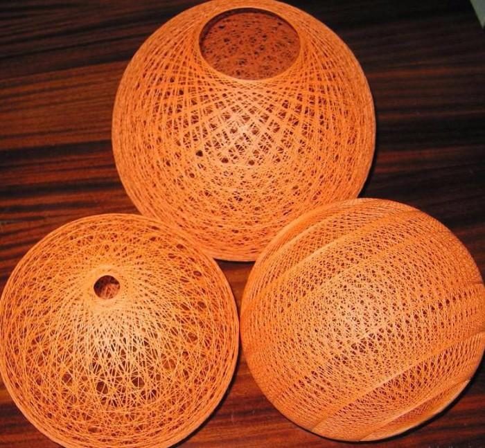При изготовлении абажура из нитей вам понадобится не менее 100 м. Не имеет смысла использовать надувные шары, как оправки, ведь после 10−20 витков шар начнет выпячиваться в разные стороны и испортит форму. Лучше всего для оправки задействовать туго надутый, прочный мяч. Оправку необходимо смазать вазелином. Далее, предварительно смазав клеем, наматывать нить на мяч. При намотке не забудьте оставить отверстие для кабеля и патрона. Спустя сутки, нужно сдуть оправку, которая, благодаря вазелину, не прилипнет к ниткам. Также нитки можно заменить на джутовый, сизалевый или пропиленовый шпагат.