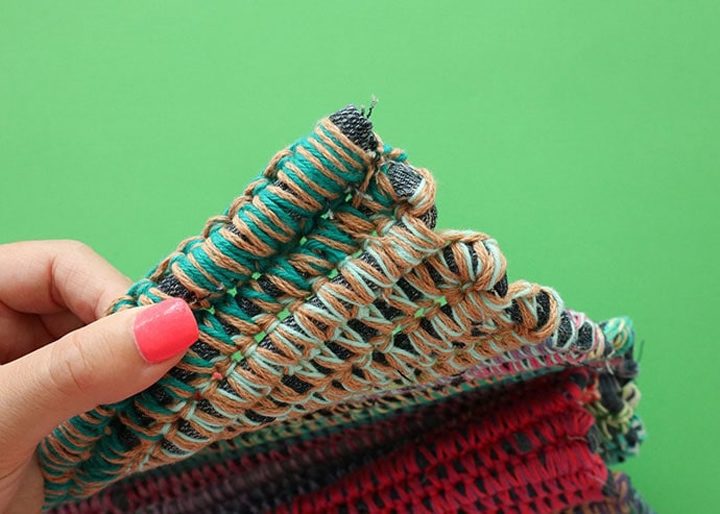 Когда коврик будет нужного размера, прекратите вязание на расстоянии 7 сантиметров от конца. Сложите джинсовую полоску на себя, заправьте концы внутрь. Обвяжите конец плотно. После провязки последнего столбика, завяжите пряжу на крепкий узел и спрячьте кончики.