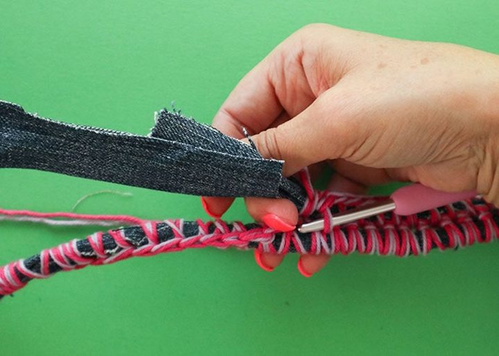 Возьмите две нити пряжи и сделайте соединительный столбик для начала. Сверните или скрутите полоску из джинсов, чтобы придать ей больше устойчивости. Она используется в качестве ядра, которое обвязывается пряжей.