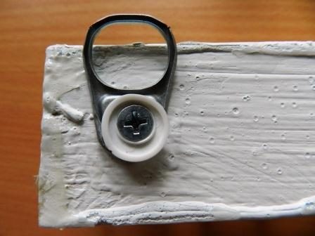 С оборотной стороны (той, что будет прилегать к стене) по верхнему краю привинчиваем металлические ключи от консервных банок или любые крепежные элементы с двумя отверстиями. Одно отверстие для крепления непосредственно к органайзеру, сквозь другое на саморезы крепим изделие к стене или шкафу.