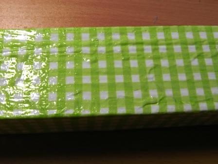 Салфетку для декупажа я выбрала клетчатую, бело-зеленую, поскольку кухонные аксессуары у меня в красно-зеленых тонах. Можно декорировать как основание, так и каждую ячейку органайзера, или же весь его целиком. У меня в проекте два органайзера, так что у одного я украсила основание, а у другого — кусочки трубки. Вместе они будут смотреться очень гармонично, на мой взгляд. «Примеряем» салфетку к поверхности, затем отрезаем необходимый кусок: для бруска, чтобы закрыть три грани и торцы, для цилиндра полоску, чтобы покрыть внешнюю часть. Убираем два нижних слоя салфетки, оставляя только слой с рисунком.