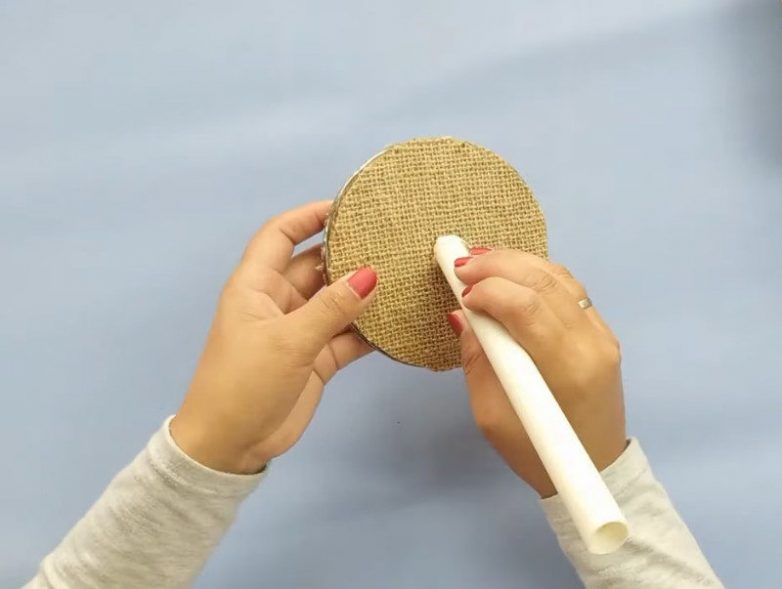 Поверхность украшаем мешковиной. Вставляем пластиковую трубу.