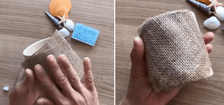 На мешковину прикрепите бисер, ракушки и другой морской декор. Идеально для ванной!