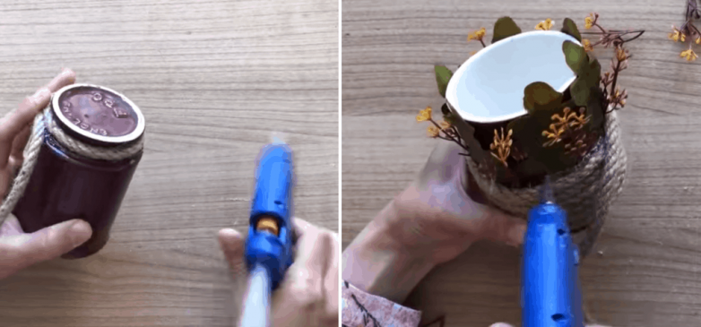 Сверху приклейте на веревку мелкие цветки. Интересная вазочка отлично подойдет для хранения косметики.