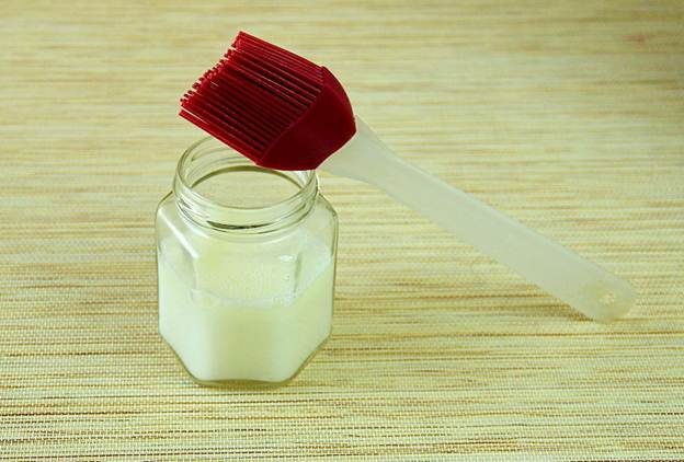 Туда же наливаем растительное масло и воду. Все хорошо смешиваем и кисточкой наносим эмульсию на стенки бутылки.