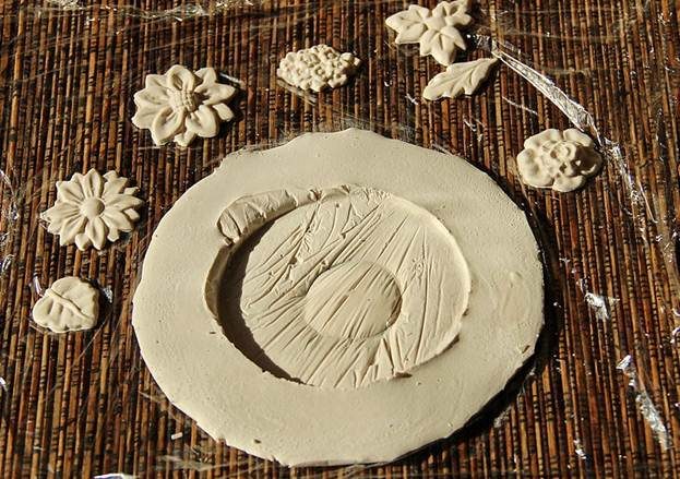 Если хотите применить в оформлении цветы, листья, фигурки, тоже сделанные из гипса, их так же заливаем и оставляем застывать.
