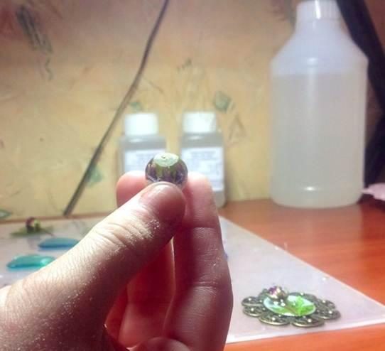 На верхушку шарика крепим шапочку (можно и приклеить на капельку смолы), затем прикрепляем швензу.