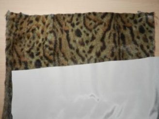 Края будущей муфты должны будут крепиться при помощи липучки внахлест, а потому перед основным пошивом следует пристрочить по краю двух деталей липучку во всю длину будущего изделия. Обратите внимание, что одну часть липучки пристрачиваем к «лицу» меховой детали, а вторую — к «лицу» плащевки. Расстояние от края — около 2 см.