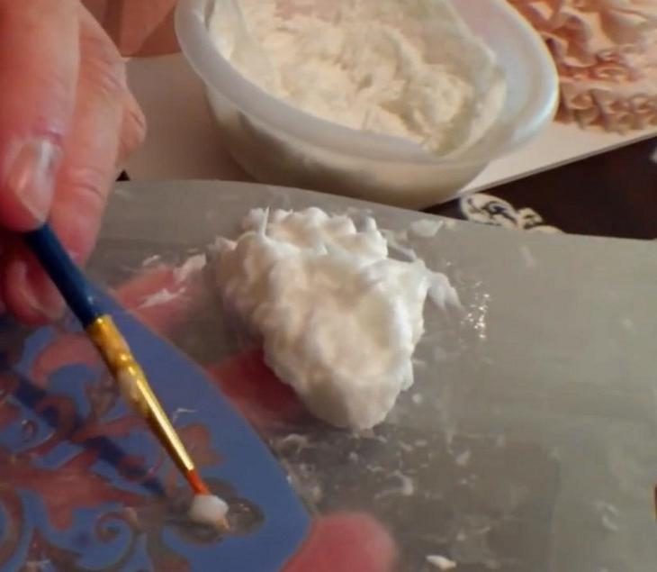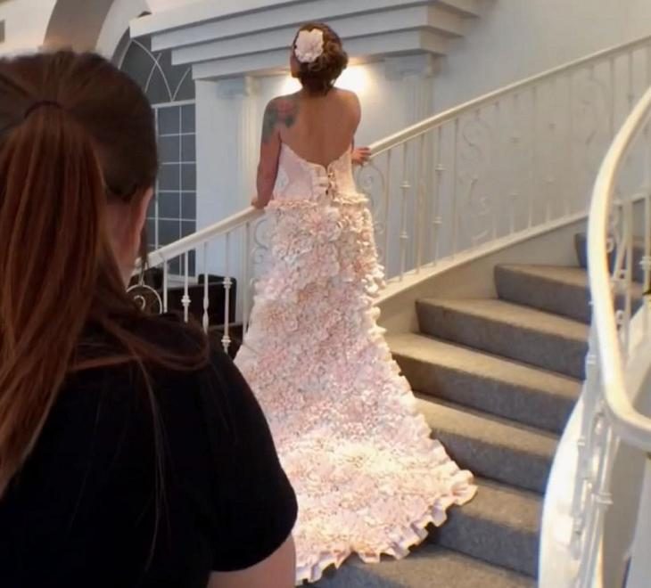 Когда бумага превращалась в однородную массу, то женщина начинала моделировать будущее платье. Для придания ему узоров, американка воспользовалась трафаретом.