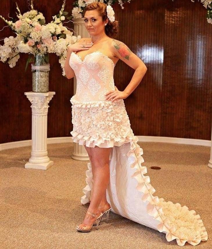 Следует сказать, что у нее действительно все прекрасно с воображением. Да и руки, как говорится, растут из правильного места. Дама решила создать свадебное платье из вареной туалетной бумаги. Поразительно до чего может додуматься (в хорошем смысле) человек.