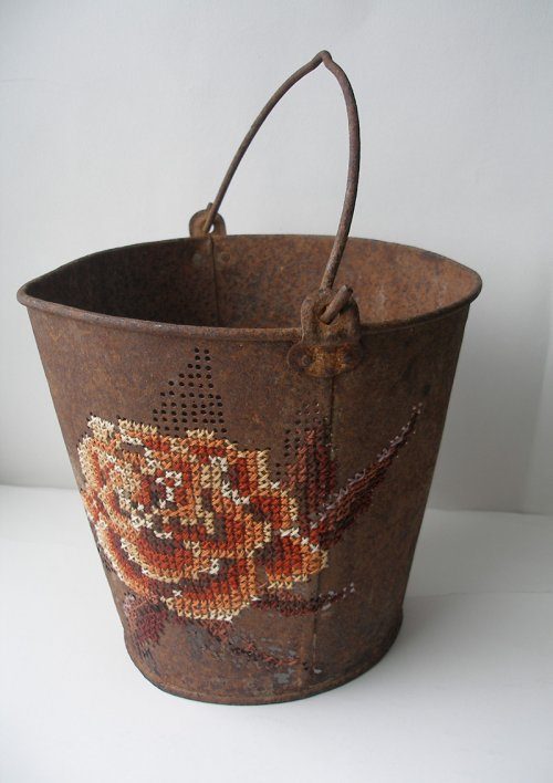 Художница переносит узоры из журналов на алюминиевые крышки, сковороды, лейки и лопаты, превращая непривлекательные вещи в престижные предметы интерьера. В качестве канвы она даже использует двери и капот автомобиля, а также огромные бочки. Словом, она не ограничивает себя ни в чём.