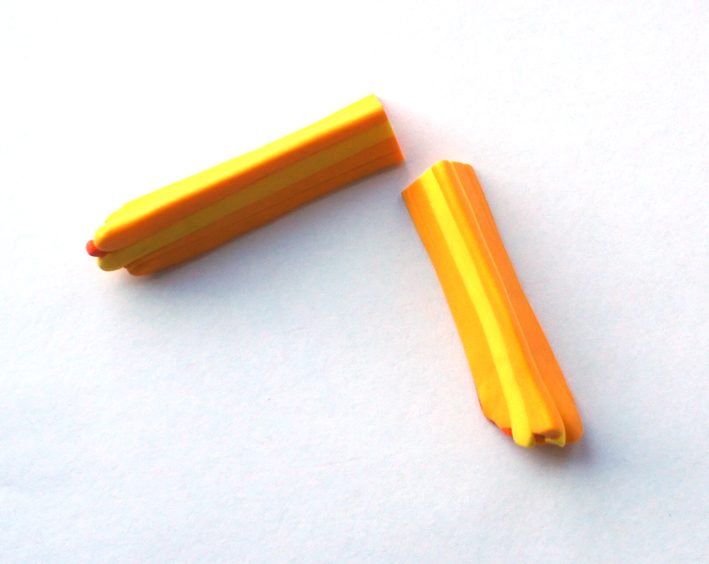 Сначала сделаем несколько видов лоскутков-заготовок для браслета. Раскатываем неширокие полоски красной и желтой пластики.