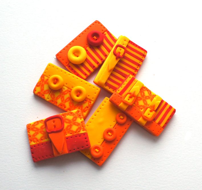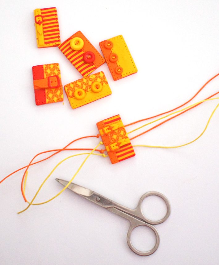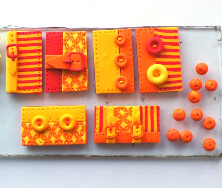 На полосу любого из используемых в браслете цветов выкладываем наши лоскутки. Комбинируем однотонные и узорчатые заготовки. Все нарезаем на прямоугольники одинакового размера. Украшаем пуговичками и ремешками. Толщина элементов, должна быть примерно в два раза толще вощеного шнура. Отправляем запекаться согласно инструкции, указанной на упаковке пластики.