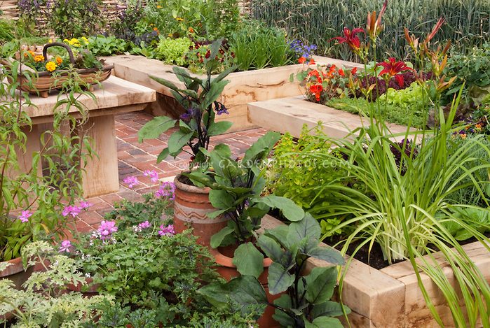 Итак, декоративный огород или овощной цветник. Его идея состоит в том, чтобы объединить различные овощные и однолетние цветочные культуры. Овощи, если их аккуратно посадить и правильно ухаживать за ними, очень декоративны и способны украсить цветники подобного типа. Какие овощные культуры можно использовать для создания такого цветника? Их достаточно много, выберите по своему вкусу: это свекла, морковь, горох, фасоль, просо, капуста краснокочанная, савойская, брюссельская, японская листовая, а также зеленные культуры – салат, сельдерей, петрушка, базилик. Отлично смотрится в таком цветнике декоративная капуста всех видов, а ее молодые листья можно употреблять в пищу. Цветники на садовом участкеПрекрасно сочетаются с огородными культурами циннии, настурции, бархатцы, календула, маки, душистый табак, мальвы, душистый горошек, бегония, всегда цветущая, цинерария. Эти нетребовательные в уходе растения – отлично дополнят овощную композицию. Такие цветники лучше разместить на солнечном месте с питательной рыхлой почвой. Их можно расположить между огородом и декоративным садом, вдоль дорожки, на фоне плетня. Особенно уместно их нахождение рядом с летней кухней.