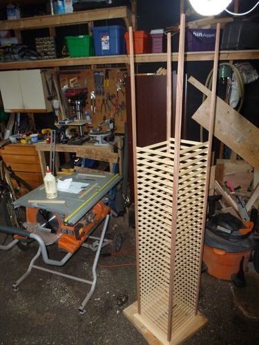 Сборка начинается с верха колонны. Сначала стыкуются и склеиваются между собой по принципу декоративной рамки наличники. Затем в них фиксируются стойки. А дальше начинается прокладка реек с обязательным проклеиванием в месте стыковки.