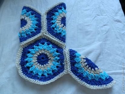 Обвязываем контрастной ниткой (последний ряд в нашем шестиугольничке), на серединке веера столбиков из 5 штук в предыдущем ряду вяжем два столбика в одну петлю, остальное — по одному столбику без накида в каждую петлю предыдущего ряда.