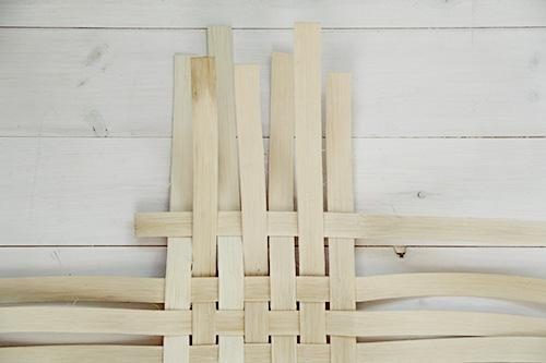 Вплетите первую горизонтальную полоску шпона. Каждую полоску вплетайте так, чтобы ее края загибались к вам.