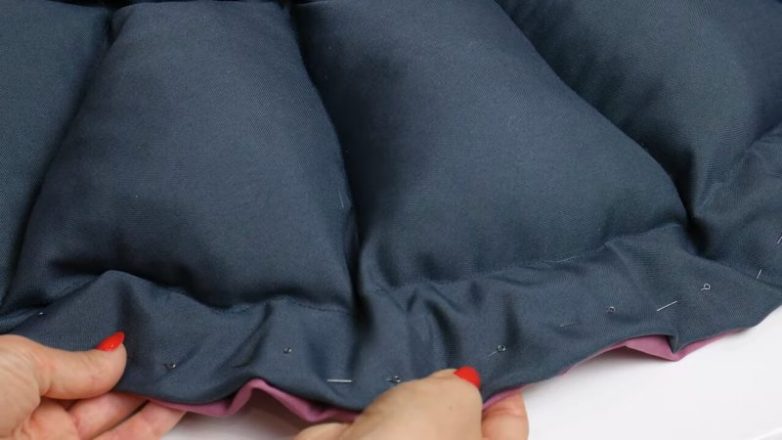 Оставшийся край (8 см) подверните вовнутрь (верхнюю и нижнюю ткань), сколите булавками и прошейте на машинке, оставляя небольшое отверстие для декоративной веревки.