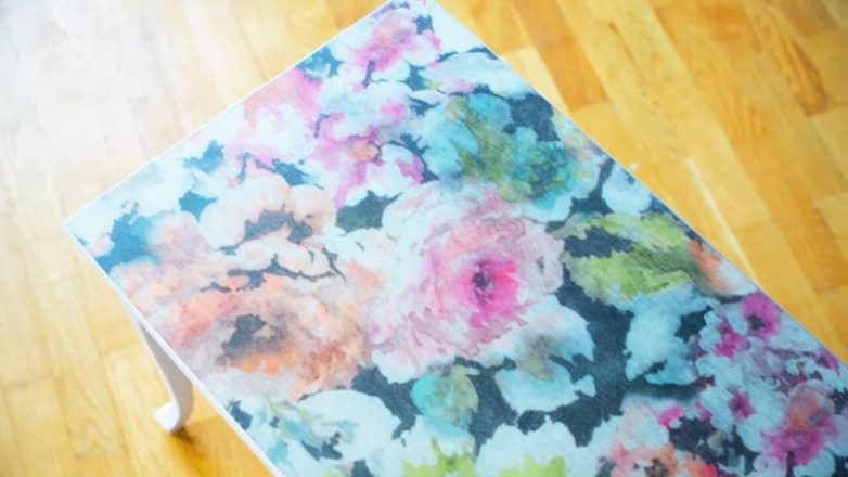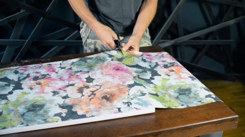 Следующий этап — покупка обоев. Выбирайте рулон на флизелиновой основе. Понадобится около 1 метра. Приклеить обои к столешнице можно на полиакриловый лак. Отмерьте нужную длину обоев, отрежьте и аккуратно, убирая пузыри, приклейте обои на лак.