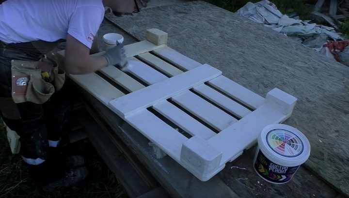Перед покраской поддонов, зашпаклюйте гвозди. После высыхания, зашкурьте шпаклевку и удалите всю пыль.