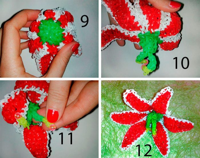 Проплетите красными резинками по одной через петлю, через любые 6 петель чашелистика. Разверните и проплетите по красным петлям ещё 5 резиночек.